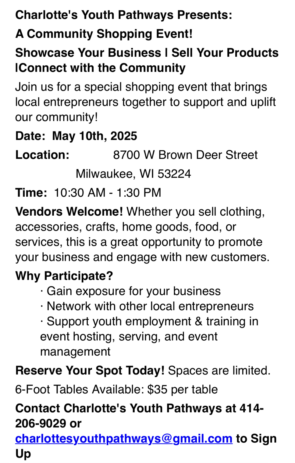 Hello and welcome to Charlotte's Youth Pathways where we strive to assist our youth in event serving. Please feel free to contact us if you have any questions on employment or any of our package deals that are listed on this website.